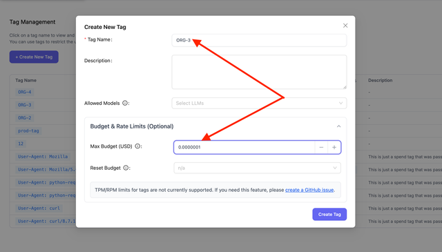 Navigate to the Tag Management page and click Create New Tag. Fill in the tag details and set your budget: